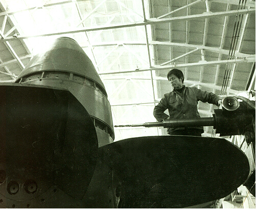 除了这台固定的旧钻床外,汪焕木和他的徒弟还有一台同样大的可移式万能钻床,这在全分厂没有第二例。开万能钻,就要“转战四方”,从厂房这头到厂房那头,从大电机厂房到重跨厂房,哪里有需要,汪焕木就要干到哪里.到处“转战”,来来去去,费时费力。而这时往往又需要爬到七八米高的工件上面去干,危险性大,不好站位,别人不愿干,汪焕木一听,拿着工具就去干。