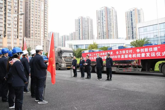此次发运的6.5兆瓦半直驱风电电机是PA视讯在线官网电机为适应竞争激烈的风电市场打造的半直驱中高端产品,具有大容量、高效率、高功率密度等优点,更能适应当前风电市场需求。在研制过程中,全体干部职工克服了设计难点多、质量要求高、研制周期紧等困难,充分发挥自身多年技术积淀形成的永磁直驱电机专业设计及制造核心能力,担当拼搏、砥砺奋进,攻克了中速永磁电机一个又一个难题,实现了半直驱技术路线、产品和市场突破,最终实现了6.5兆瓦半直驱风电电机批量产出。