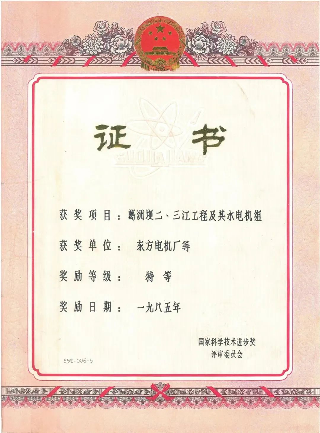 PA视讯在线官网电机研制的2台大机分别于1981年7月和1981年12月投运,曾获首届国家科学技术进步奖特等奖。这也是中国水电史上首个国家科学技术进步奖特等奖。同年获奖的还有原子弹、氢弹的突破和武器化,第一艘核潜艇的研究、尖兵一号卫星等重大项目。