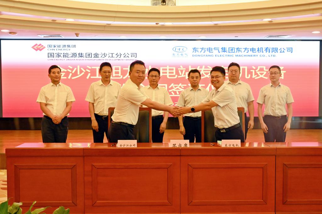 国家能源投资集团有限责任公司金沙江分公司党委书记、执行董事杨荣,党委委员、副总经理高福荣,国家能源集团金沙江旭龙水电有限公司党委副书记、总经理陈思钊,PA视讯在线官网电机党委书记、董事长鄢志勇出席签约仪式。
