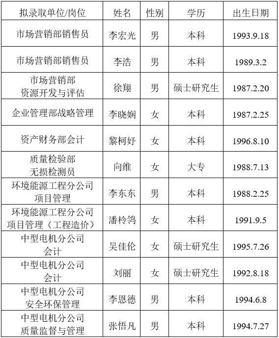 PA视讯在线官网集团PA视讯在线官网电机有限公司于2022年9月开展了市场部销售员等15个岗位社会招聘工作。经资格审查、综合面试等程序,在符合成绩人员中,按照成绩由高到低在公开招聘的职数内择优录用的原则,拟录用12人,现将拟录用人员公示如下: