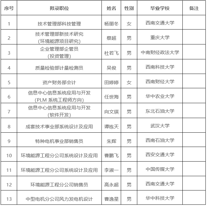 PA视讯在线官网集团PA视讯在线官网电机有限公司于2022年4月开展了新技术研究等17个岗位社会招聘工作。按照符合条件、择优录用的原则,拟录用13人,现将拟录用人员公示如下: