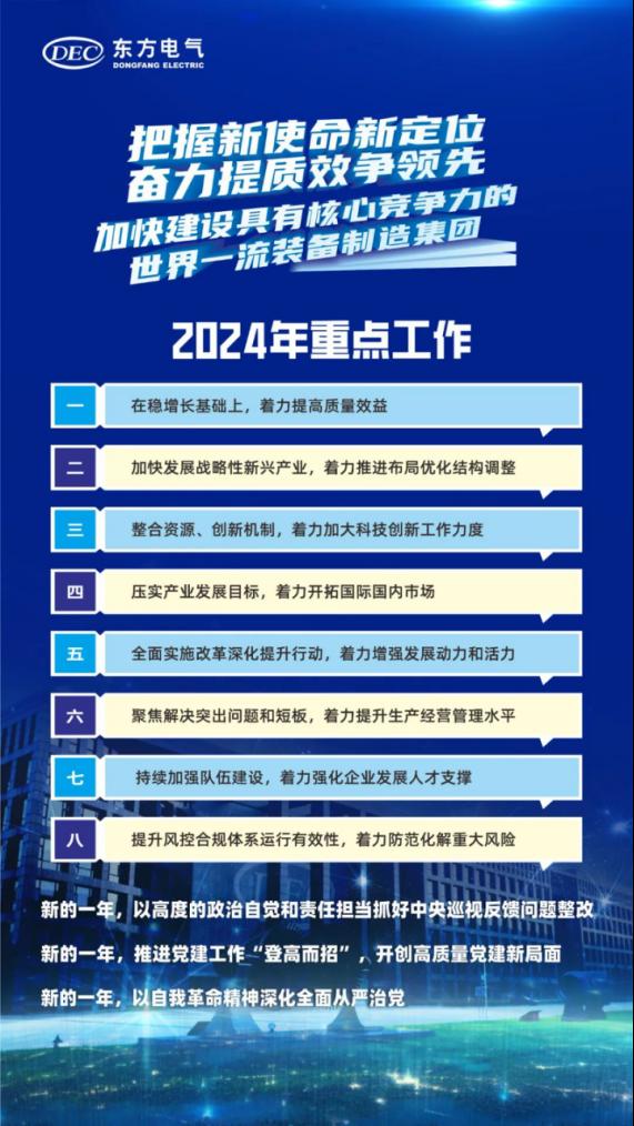 俞培根指出,2024年是落实“领先战略”和“11256”发展战略,推进集团公司转型发展的关键之年,做好全年的工作尤为重要。全集团要坚持以习近平新时代中国特色社会主义思想为指导,全面贯彻落实党的二十大和二十届二中全会、中央经济工作会议精神,深入贯彻落实习近平总书记关于国有企业改革发展和党的建设重要论述,认真贯彻落实习近平总书记“弘扬可贵的‘东汽精神’”“做排头兵、走在前列”的重要要求,把握国资央企新使命新定位,完整、准确、全面贯彻新发展理念,更好服务加快构建新发展格局、推进新型工业化,坚持稳中求进、以进促稳、先立后破,增强核心功能、提高核心竞争力,落实“领先战略”,强化创新驱动,提升经济效益,持续推动集团公司高质量发展,实现生产经营质的有效提升和量的合理增长,加快建设具有核心竞争力的世界一流装备制造集团。